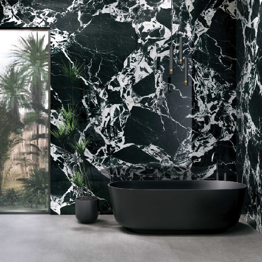 Rich black marble with refined white veining—classic high-gloss luxury.