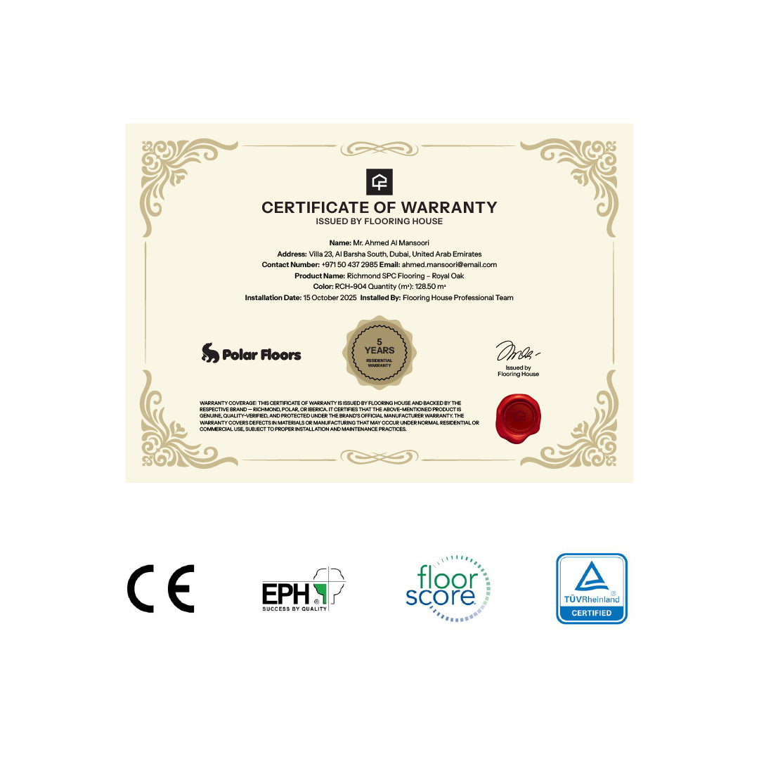 This warranty applies to Polar SPC (Straight Planks & Herringbone) and Polar LVT (Straight Planks) flooring products and covers the flooring material only against manufacturing defects when used under normal conditions and properly maintained.